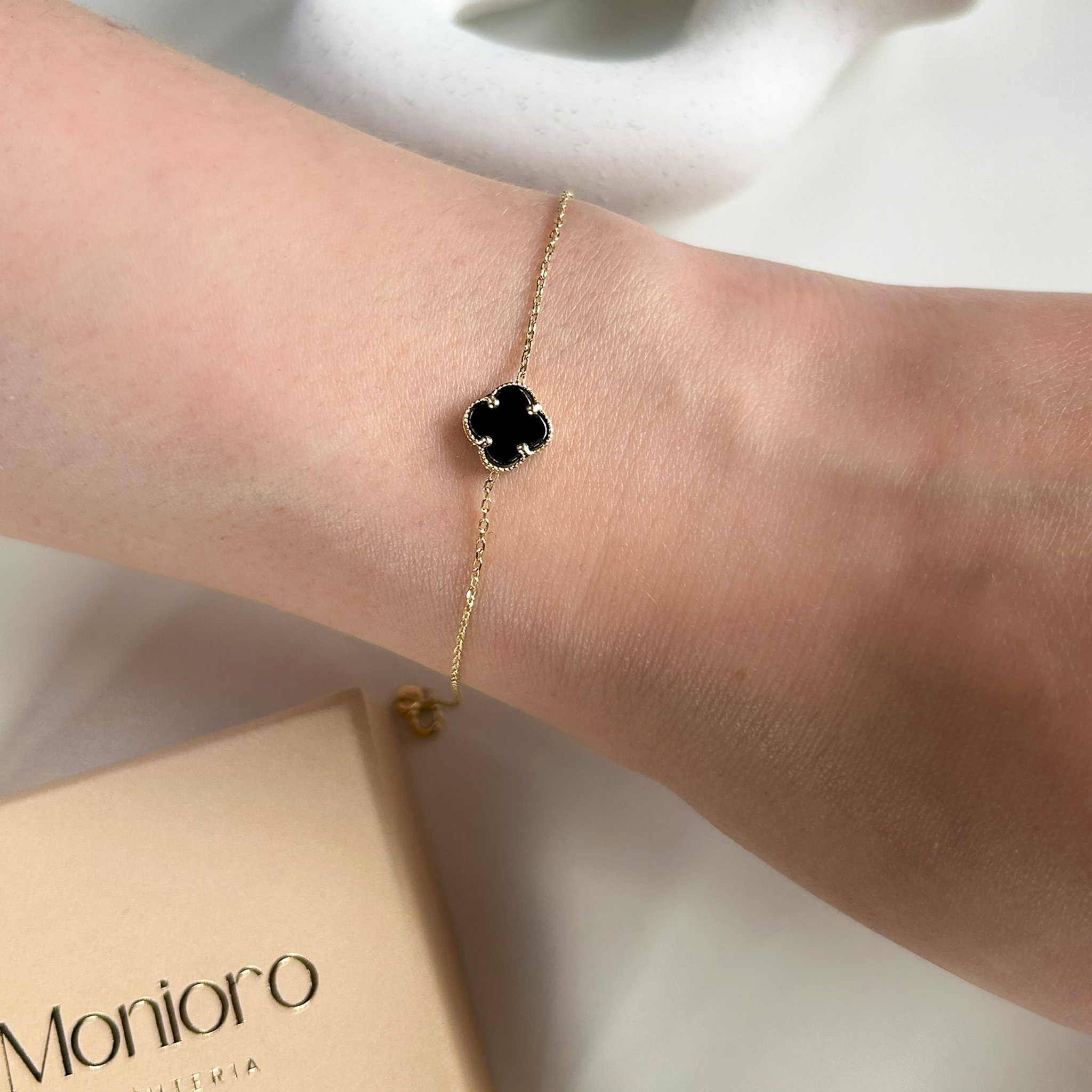 Złota bransoletka wykonana ze złota próby 585, ozdobiona dużą czarną koniczyną marokańską – symbolem szczęścia i elegancji. Subtelny łańcuszek typu anker w połączeniu z wyrazistym detalem tworzy ponadczasową biżuterię, idealną zarówno na co dzień, jak i na wyjątkowe okazje.