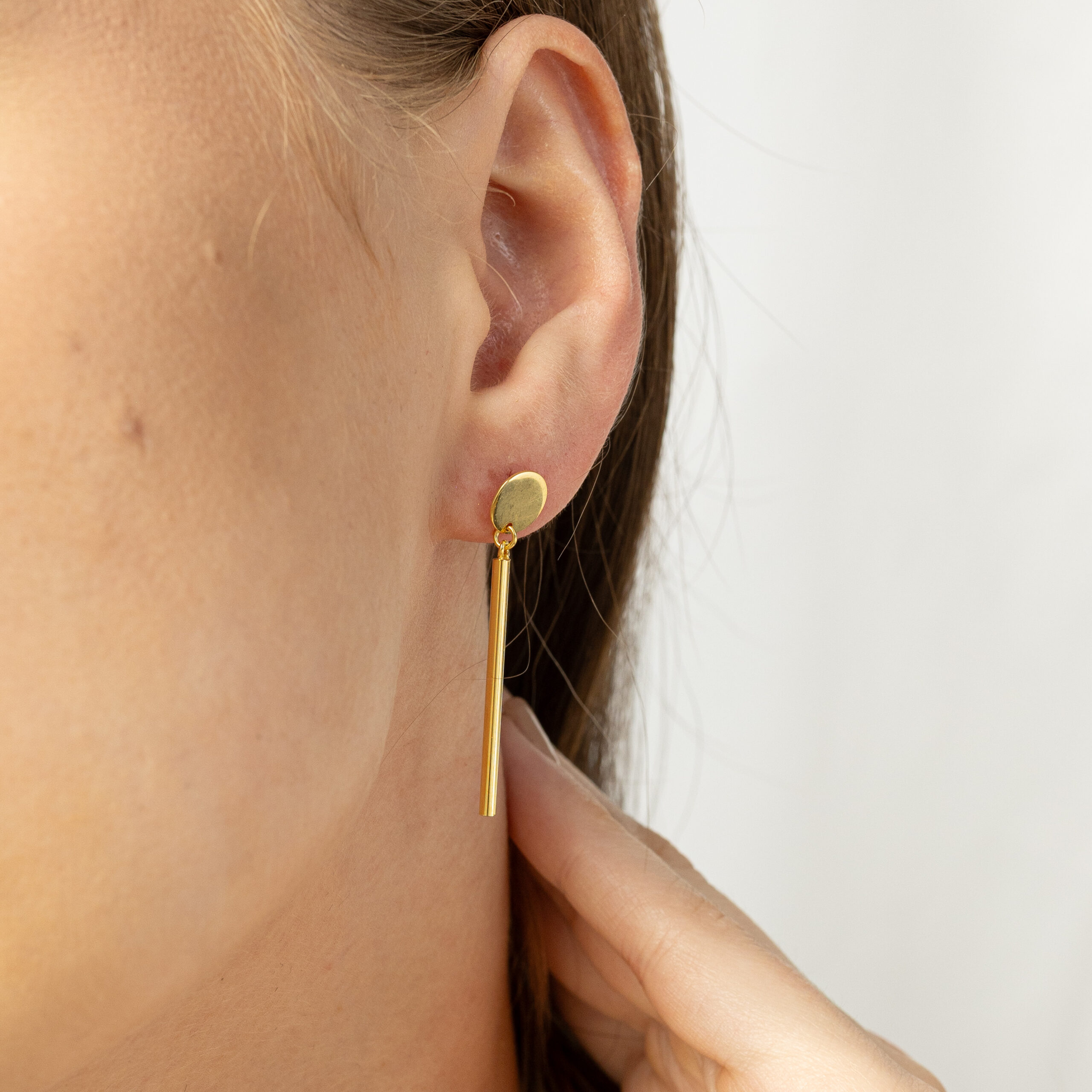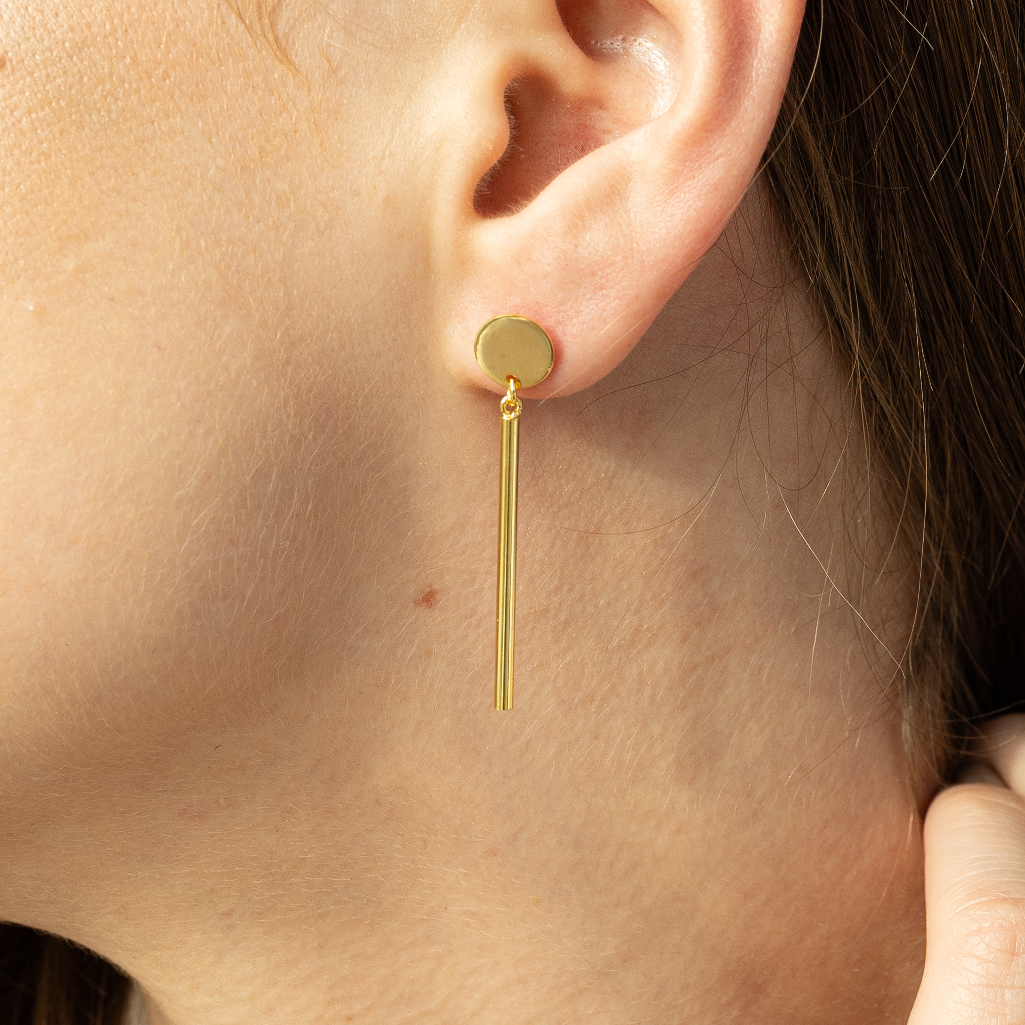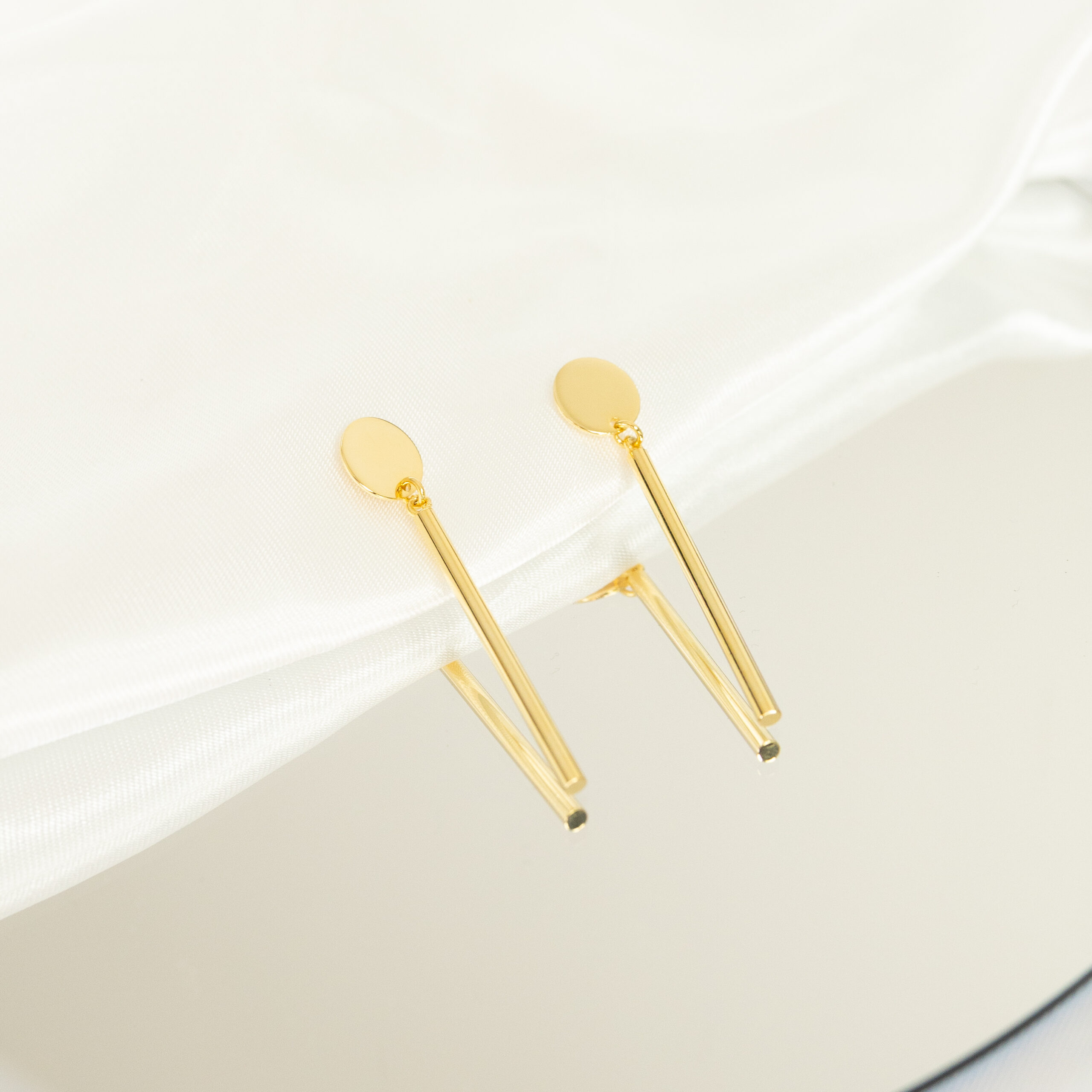 Serena lekkie, geometryczne i niezwykle stylowe kolczyki. Wykonane ze srebra próby 925, pokryte warstwą złota, łączą okrągłą blaszkę z błyszczącym, smukłym patyczkiem, który swobodnie zwisa i pięknie porusza się przy każdym ruchu. To biżuteria, która doskonale uzupełnia minimalistyczne stylizacje, nadając im nowoczesny sznyt i odrobinę artystycznego wyrazu.