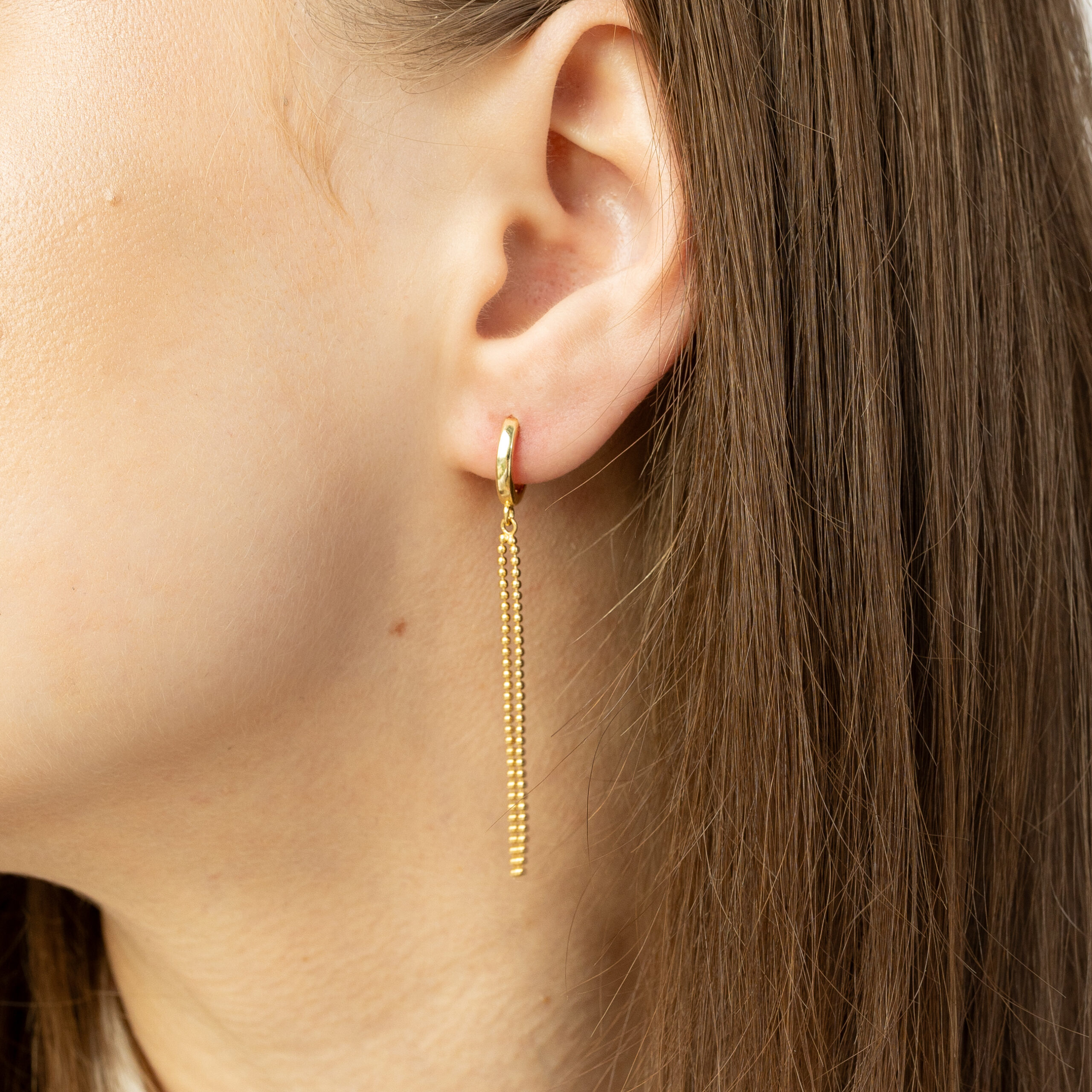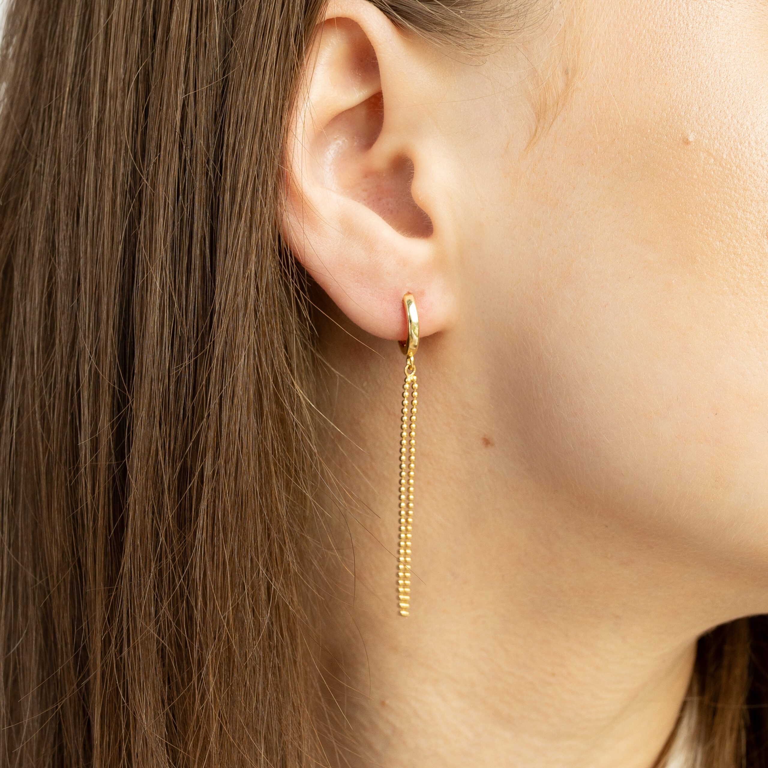 Nowoczesna forma w lekkim, kobiecym wydaniu. Kolczyki Aria to połączenie minimalistycznych, pozłacanych kółeczek z delikatnymi, wydłużającymi łańcuszkami w formie kuleczek, które subtelnie poruszają się przy każdym ruchu. To biżuteria, która nie potrzebuje wielu słów – jest pełna elegancji, ale z nutą swobody. Złoty połysk nadaje im wyjątkowego blasku, a smukła forma optycznie wydłuża szyję i podkreśla rysy twarzy.
