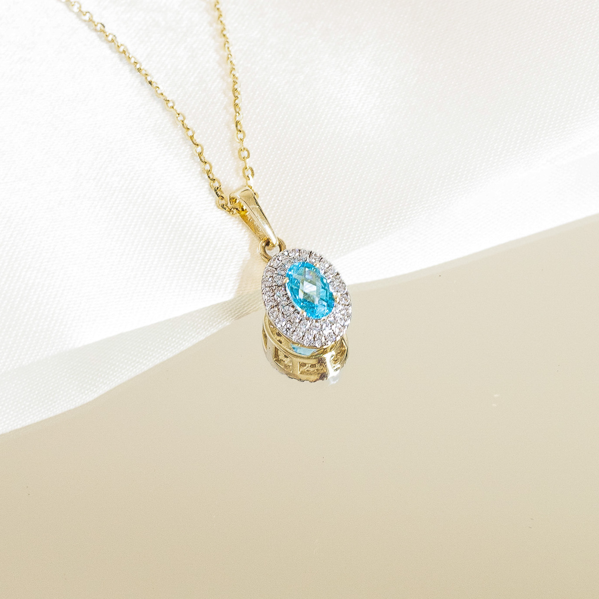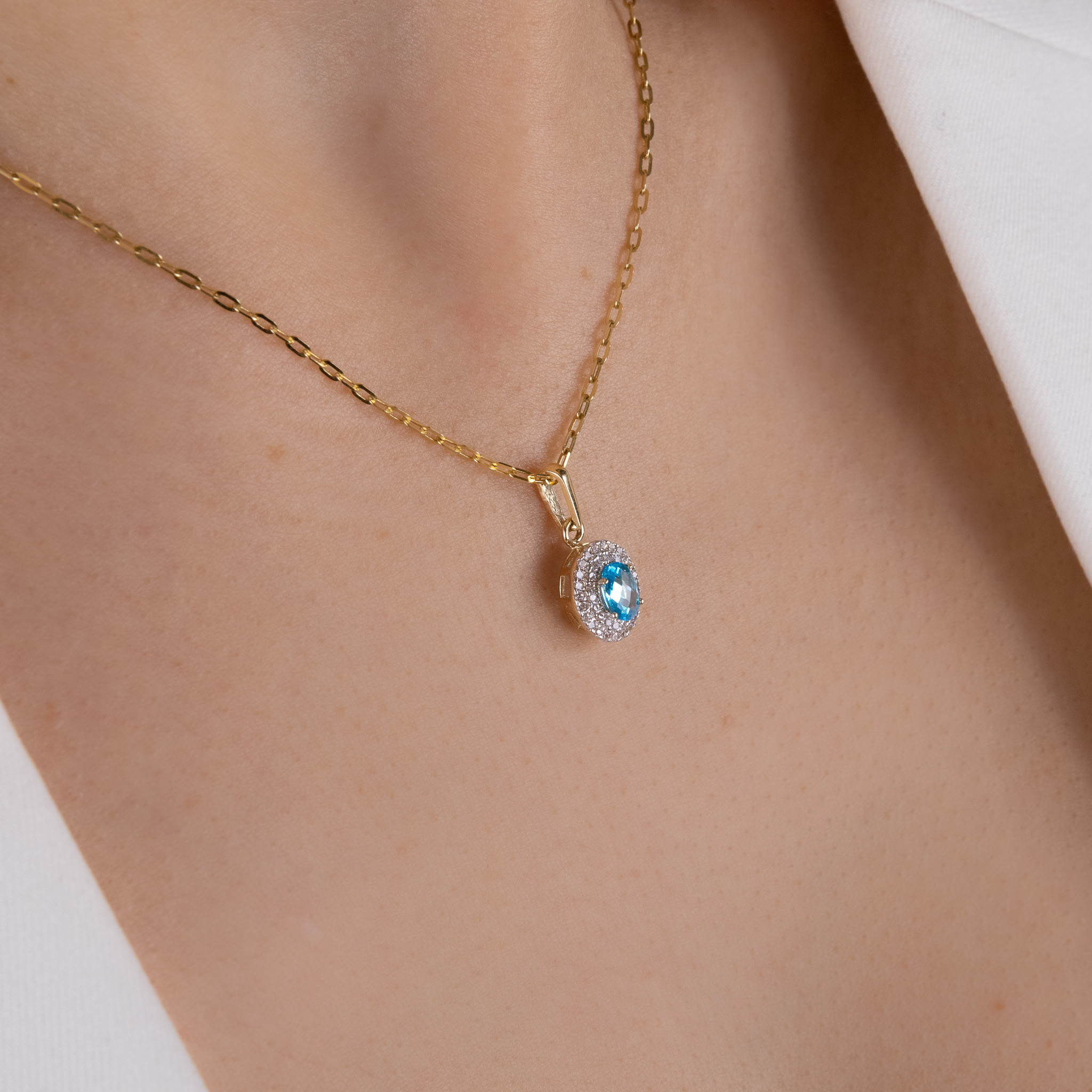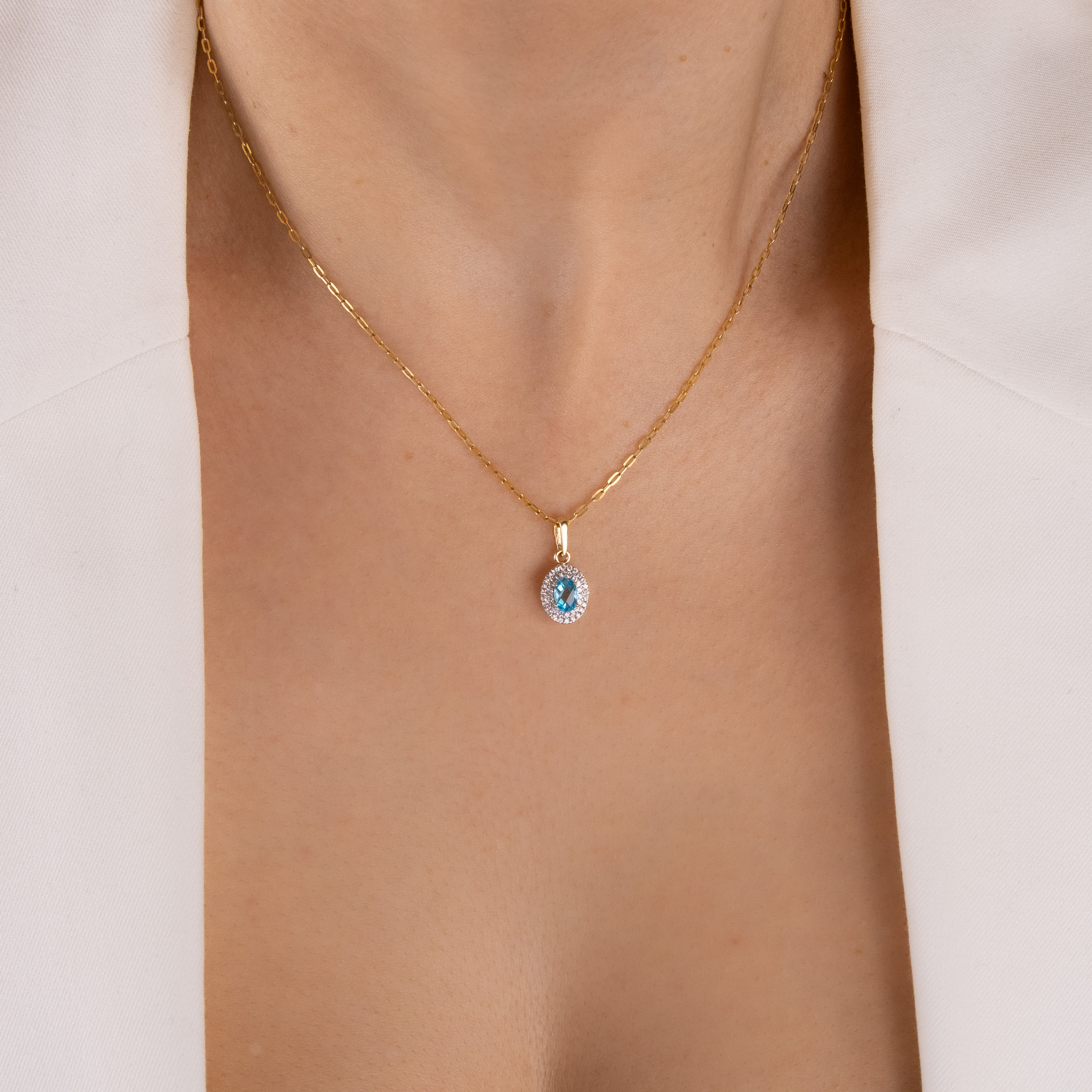 Złota zawieszka z błękitnym kamieniem i cyrkoniami to elegancki dodatek, który zachwyca świeżością koloru i delikatnym, świetlistym blaskiem. Wykonana ze złota w próbie 585, wyróżnia się centralnym błękitnym kamieniem, którego jasna, subtelna barwa dodaje biżuterii lekkości i wyjątkowego charakteru. Otaczające go błyszczące cyrkonie podkreślają jego kolor i nadają całości luksusowego wykończenia. Wisiorek doskonale sprawdzi się zarówno do codziennych stylizacji, jak i na wyjątkowe okazje, pięknie rozświetlając dekolt i podkreślając kobiecy styl.